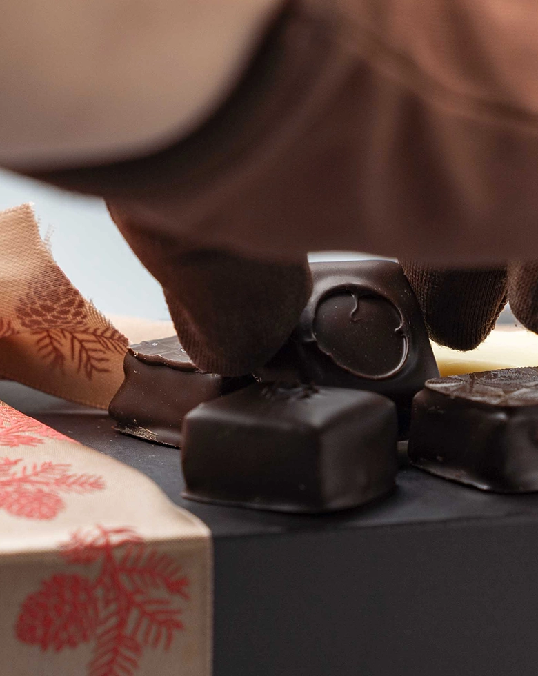 Chaque chocolat est façonné à la main, coulé dans des cadres puis détaillé avec précision. Le tempérage se fait au geste, pour révéler toute la brillance et le craquant du chocolat. Les enrobages se travaillent avec délicatesse, les découpes se font avec rigueur, les finitions demandent patience et justesse. Tout repose sur la maîtrise du temps et de la température : des gestes répétés avec passion, qui transforment la technique en émotion.
